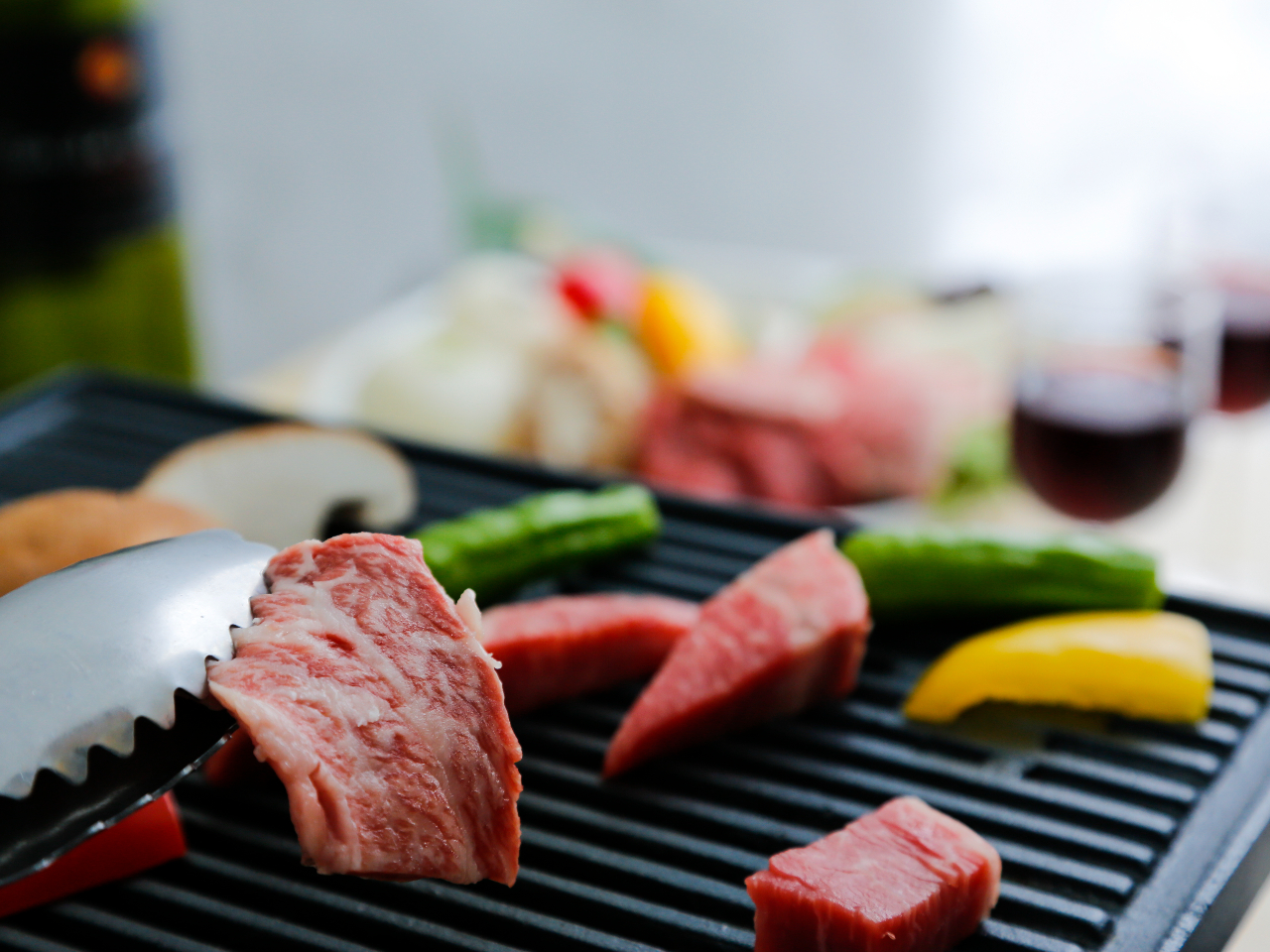 目の前で焼く但馬牛、お好みの焼き加減でどうぞ