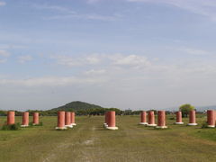 持統,文武,元明天皇の三代16年間(694?710年)の宮跡。藤原京は、中国(唐の長安)を模して造られた日本初の本格的な宮跡。大小の道路によって区画され、「条坊制」という町割り制度が敷かれていました。宮殿建築で初めて屋根に瓦を葺くようになりました。また,役所にあたる朝堂院は平城京の朝堂院より大きかったそうです。“春すぎて 夏来たるらし 白妙の 衣ほしたり 天の香具山”持統天皇の歌はここで詠まれた。