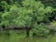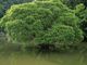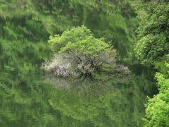ダム湖に映る水没林の新緑が美しい。