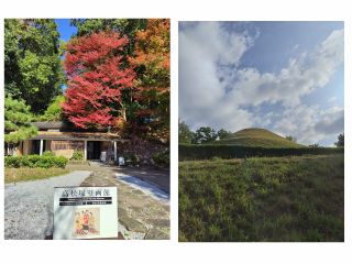 <特製クリアーファイル進呈中>自然の中、高松塚古墳を散策、横の壁画館では発見当時の様子をご覧頂けます。壁画を忠実に再現した模写壁画、再現模造模写や精巧にできた石室模型や副葬品模型が展示されています。