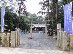 片岡城跡の南、小高い山林の上にある神社です。神社に行くには、片岡城跡のすぐ南側を通る細い道を西または東からアクセスし、途中の三叉路で南下して200mほど進みます。途中には何カ所も車バリアが設けられていて、歩いて行くしかありません。しかも片岡城跡のまわりは私有の畑になっていて、その中の里道のような細い道を進むのです。