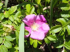 5月下旬から6月上旬が、花が咲き揃う時期かなと思いました。ハマナスは草花だと思っていたのですが、解説パネルを見たらバラ科に属する落葉低木とのことです。同じくバラ科のイバラに近い姿をしていて、木の高さは1mにも届かないし刺も持っています。