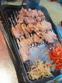 写真はサムギョプサル2名分です!写真には写ってないですが、ナムル・キムチ・サンチュ・えごまの葉はなんとおかわり自由です(*^_^*)とてもボリュームがあります!
