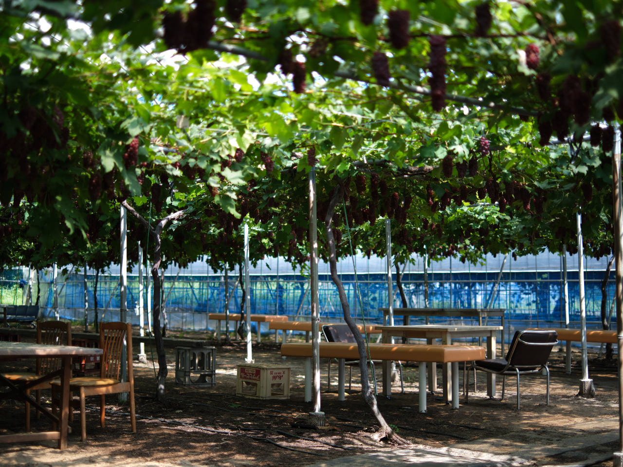 葡萄棚が日陰になって外よりは多少涼しかったですが、飲み物、タオルは必需品かなと思いました。携帯扇風機があるといいかな。