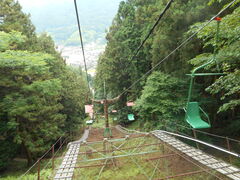 津和野は町がコンパクトにまとまっているので、移動が早い。事前作成の行程表よりも、全体を通じてかなり余裕ができました。前倒しで予定消化していけます。森鴎外記念館からほんの2、3分。乗り場の下が駐車場です。20台くらいは停められそうです。係のおじさんにお金を支払い、回ってくるリフトに観覧車方式で乗り込む。が、椅子自体は武骨な金属そのもので、まあまあ早いスピードが出ていますので、座るタイミングがずれると、したたかにふくらはぎ付近を打ちます。妙に痛いなあ、と入浴時に妻に見てもらうと、見事に青あざになっていました。ご注意を。リフトそのものは高所恐怖症の私でも大丈夫。楽しかったです。でも、これ履いているゴムサンダルが脱げたり、首に巻いているタオルが落ちたりしても、取りには行けないのでしょうね。そんなことを考えているうちに、終点到着。ちなみに降りるのにもコツが要ります。キモは躊躇しないこと。