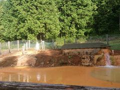 六日市インターから益田津和野方面に行く途中にある木部谷温泉松乃湯さんで日帰り入浴しました。浴槽の底が見えないほどに黄土色のお湯で恐る恐る湯船に入ると初めはぬるま湯でしたが、ほかのお客さんが「暖めますよ。」と配管のバルブ を回したとたんにゴーシャーと蒸気であっという間にお湯が温かくなりました。源泉が流れ出てくる配管もありそちらのバルブを開いてお湯をさましたりと自分で温度調整ができるようになっていてゆっくりとできますよ。黄土色で鉄錆びの匂いのする濃厚なお湯は体の悪いところを癒してくれる薬湯のようで、お湯のみを楽しまれる方向きの温泉です。裏山にある間欠泉も見学出来るようになっており、少し登るとちようど源泉が噴水のように吹き出ていてプールのようなところに源泉がたまって黄土色に染まった水路で下に流れていました。炭酸ガスの力で地面から源泉が噴き上がってやがてしぼんでくるのを見ると自然が産み出す温泉パワーを感じられますよ。