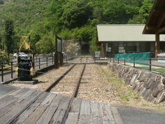 八田原ダムができてルート変更された福塩線の廃線跡にあります。とくにパークゴルフ場の受付・管理棟付近には踏切の遮断機らしきものがあるほか、レールもほぼそのままの状態で残っています。管理棟から橋を渡ったところにある18ホールのグリーンも、河佐駅のほうへ向かって伸びる廃線跡沿いにつくられています。廃線跡は遊歩道になっていて河佐峡キャンプ場まで続いています。