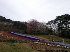 普段でも関門橋や海がキレイに見えて景色が良いのですが、桜の時期は特におすすめです。山の緑と、いろいろな色のチューリップとピンクの桜がキレイです。