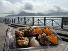 毎週金土日の朝9時30分から市場内にお寿司街道がオープンします。道が渋滞するほどの混雑ぶりぶりで、9時30分の鐘を合図に一斉にお寿司屋さんが販売を開始します。天気の良い日には目の前の関門海峡と関門大橋を眺めながら、海鮮丼やお寿司でピクニックランチも楽しいです