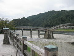 JR岩国駅前から出ているいわくにバスで錦帯橋へ。15分ほどで錦帯橋近くのバス停に到着、川の岸辺にある遊歩道から斜め前方に見える錦帯橋は圧巻。実際に橋を歩いてみると、斜めから見えた錦帯橋の景色とは全く違って見える。五連のアーチの角度がきつい部分は、滑り止めのため緩やかな階段状になっている。橋の上から見える錦川の表情も素晴らしい。シラサギが川面の小魚を待ち構えている。橋上からは、ロープウェイや岩国城が見える景色も素晴らしい。