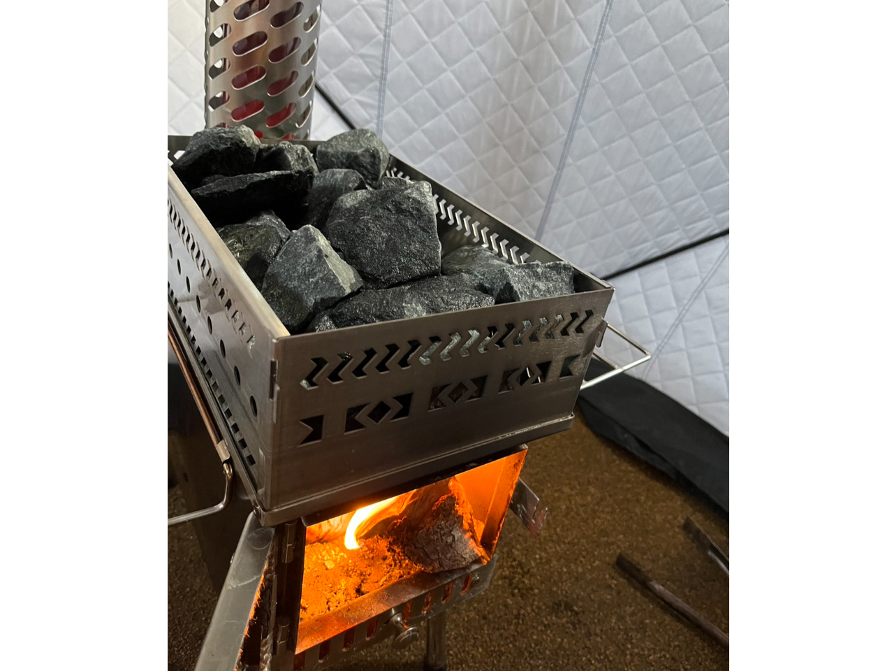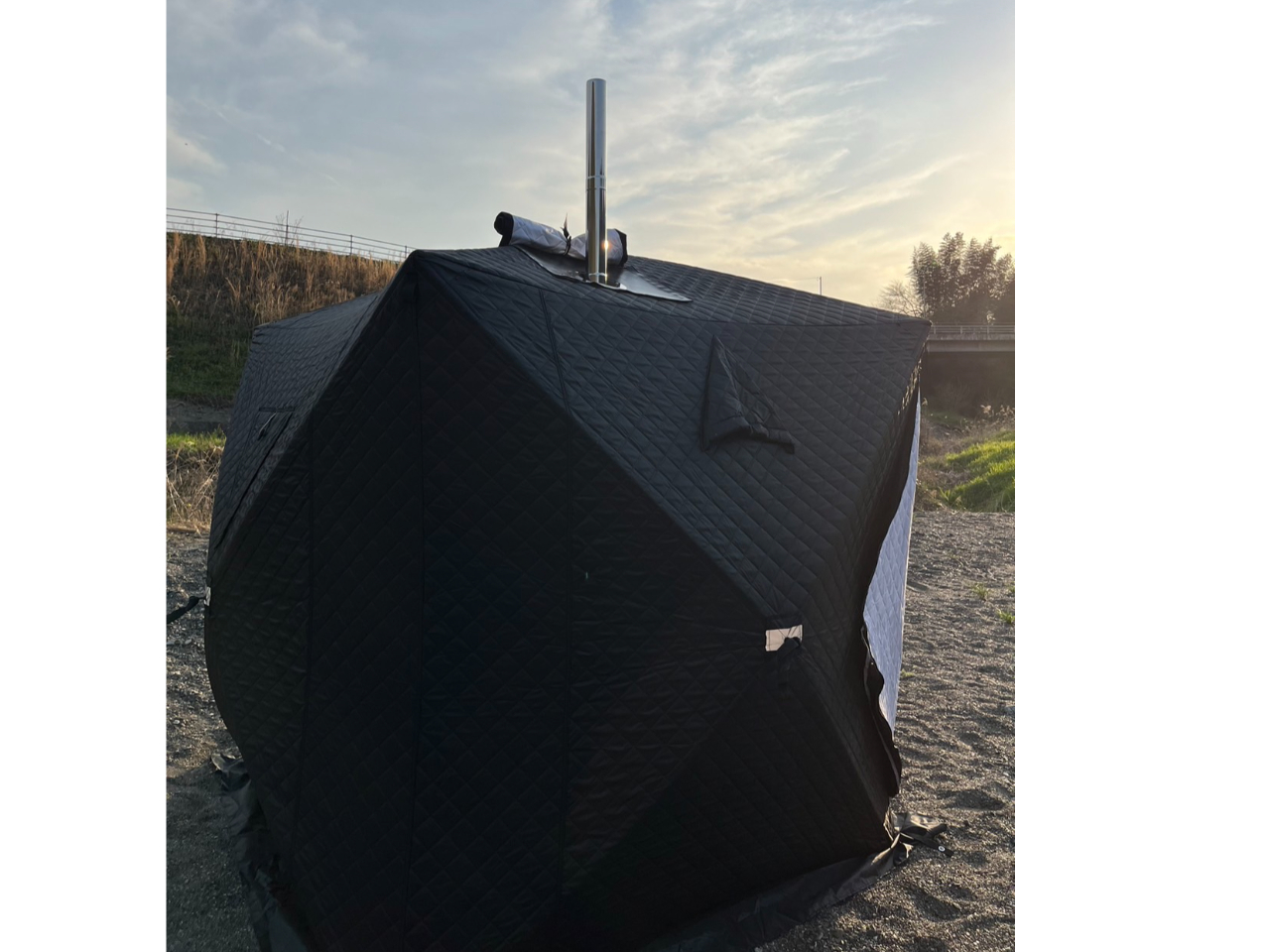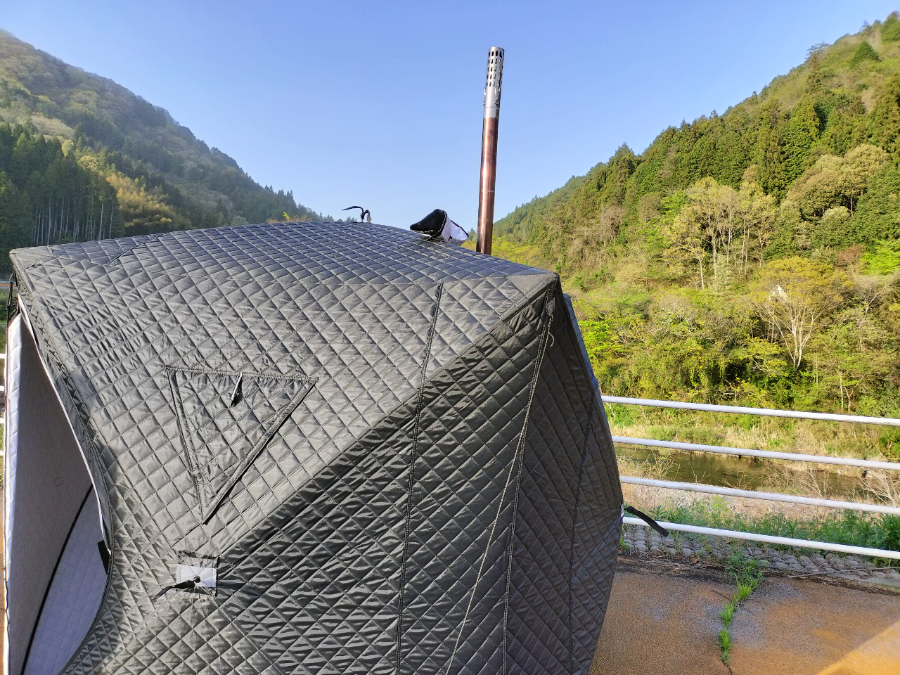 ・テントサウナを河原に設置!薪ストーブで火を起こして、温度上昇!