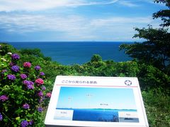 駐車場から遊歩道(車道)を歩いて行くと桜がある広場に到着。桜はすでに散っていましたが、その代わりにアジサイが咲いていました。灯台へは枝が延びている樹間の道を登りますが、灯台周囲は草ボウボウで周囲の木々が大きくなっていて見晴らしは良くありません。