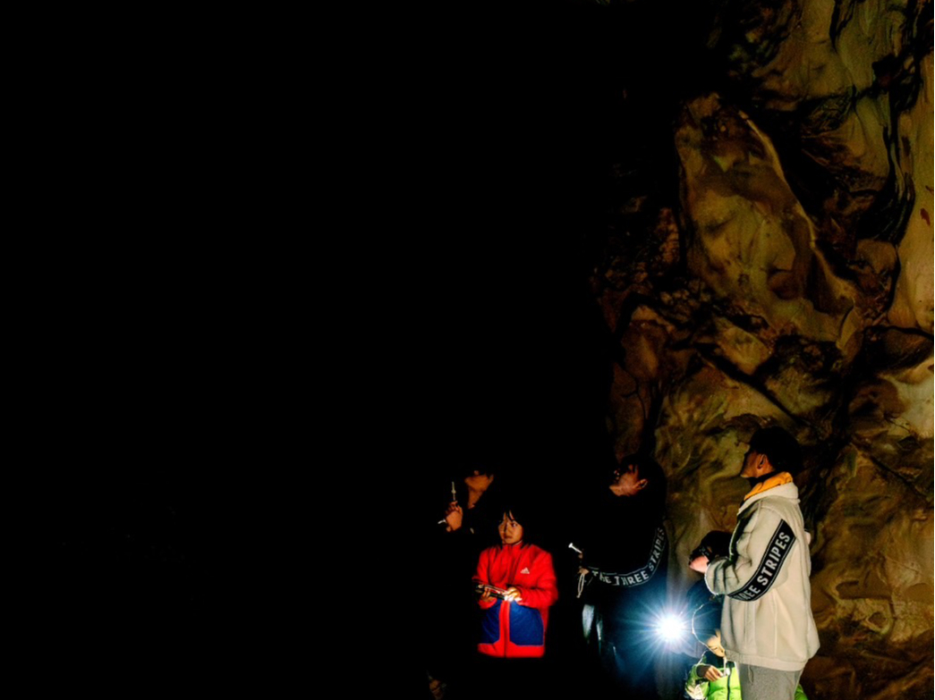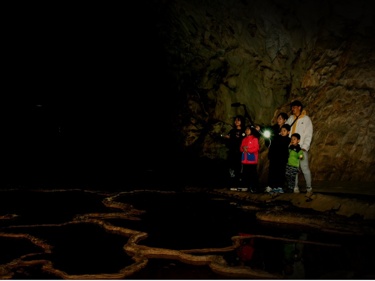 懐中電灯の光だけを頼りに進む、秋芳洞の特別探検ツアー。暗闇の中で地球の鼓動と自然の神秘を体験できます。