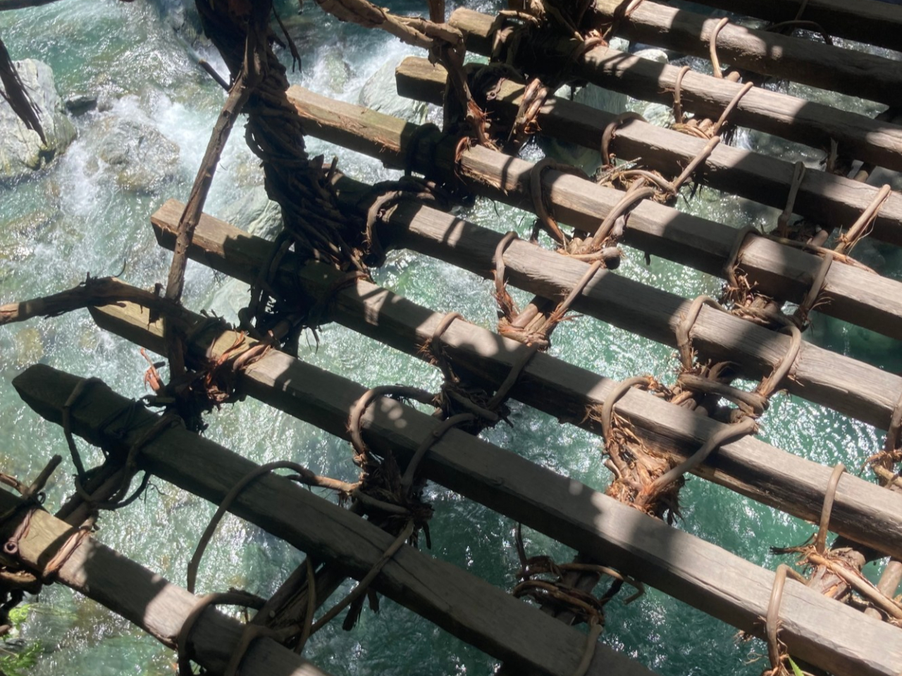 シラクチカズラを編み連ねて作られ、橋床の隙間から谷底が見えます!長さ45mの吊り橋の揺れと相まり適度なスリルが味わえます♪