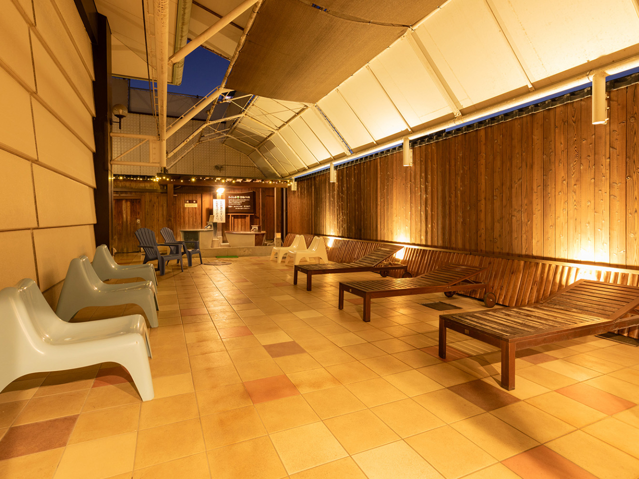 男湯にインフィニティチェア、手作りのフラットベッドが追加され、フラット姿勢で外気浴がしやすくなり快適度が上がりました