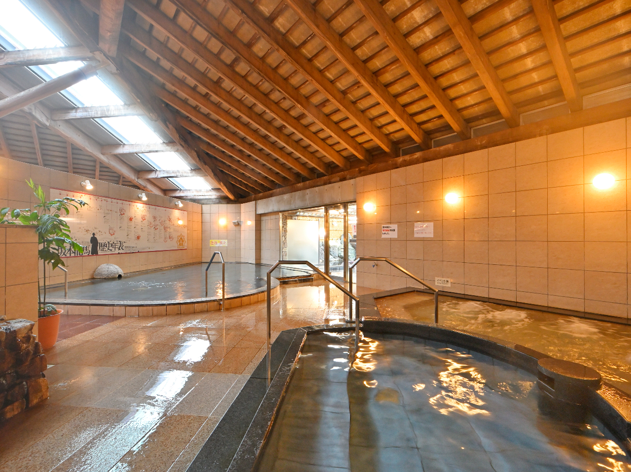 龍馬の生涯を表現した、歴史年表や人物相関図が、南北の浴室にそれぞれ壁一面に描かれています。