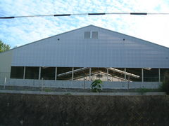 このテニスコートはなんと屋根付きです。しかも良く見ると足元は土と芝です。屋根だけかけているのですね。それが2棟あります。テニス教室まで開催されています。しかも受付棟は木に囲まれたしゃれた造りです。なかなかにおしゃれで気の利いたテニスコートです。