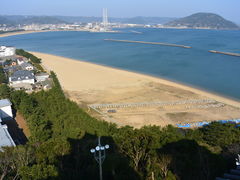 唐津城を起点にして舞鶴橋を渡って東側の砂浜が東の浜海水浴場なのですが、西の浜海水浴場は唐津城のすぐ西側にあります。天守閣からも様子が良く見えました。砂浜はきれいな黄土色で幅広く、波穏やかです。3月に訪れたので人影はありませんでした。