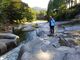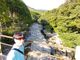 つり橋を渡り、階段を下りるときれいな川が流れています。川にあるのは大きな一枚石です。水の流れで削られ、壮大な景色になっています。