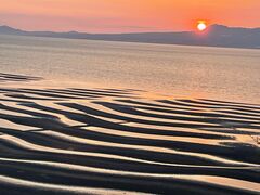 御輿来海岸の夕日に照らされた波紋を見たいのですが、大潮の干潮時間と日没の時間と天気が上手くあわないと綺麗な夕日の波紋は見れないようです。今回は3時18分が干潮、日没が19時頃とのことで生憎夕日に照らされた波紋は見れませんでしたが、雨が上がり綺麗な波紋を見ることができました。浜辺では多くの人がマテ貝を掘っていました。とても長閑な日本の風景でした。