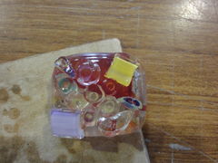 ガラスのアクセサリー作りを体験しました。好きな色の土台を選び、その上に軽く糊付けして色ガラス片を置いていくだけの作業ですが、滑るので、小さい子供には少し難しく、親の手が必要でした。その後、仕上げに焼いていただいて、出来上がりは自宅に郵送していただきました。ネックレスにして仕上げていただき、子供は喜んでいました。