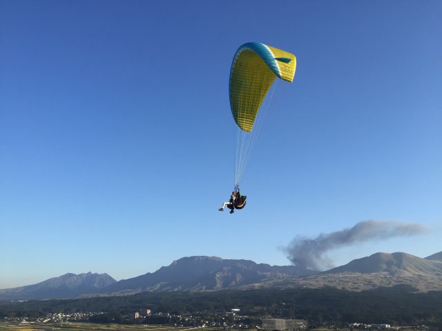パラグライダーでの2人乗り操縦体験は日常の生活をしていたら決して見ることの出来ない鳥の目線になることが出来ます。本当の空中散歩はここにあり、雄大な阿蘇の信じられない景色と空の声を体感できます。100%感動の非日常体験はこれだけ!!