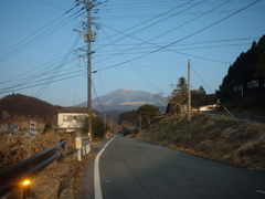 大分側のやまなみハイウェイから見た時は雪を被った山だったのですが、小国町の北里地区から茶色い山肌の涌蓋山が真正面に見えます。山頂部と肩部のあたりの形が特徴的です。大きな木がなさそうに見えるので、阿蘇周辺の山と同じように牧草地となっているのかも知れません。押戸石の丘山頂部から順路にそって正面左手に見えるのもこの涌蓋山だそうです。