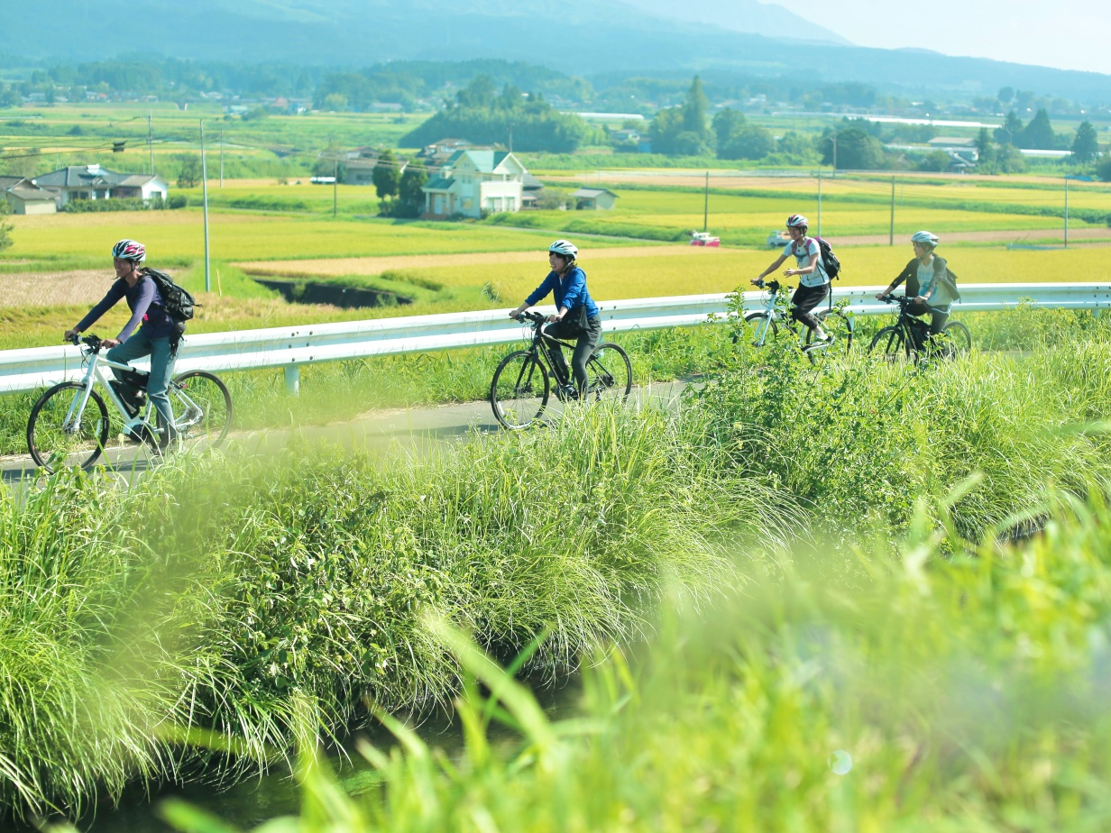 A村内には樹齢300年の御神木のある八坂神社や地下水の湧き出る水源、風情ある田んぼの一本道など様々なコンテンツがありこれらを自由にサイクリングで訪れることができる。