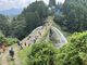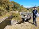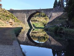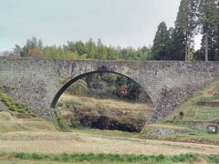 地震と水害により被災し、その復旧工事のために橋上の観光や橋からの放水が中止された状態が続いていたが、工事が完了したので立ち寄ってみた。道の駅通潤橋に車を停め、橋上観光の手形を買ってから、売店の北側の小さな橋を渡って川の左岸に沿って橋に向かった。遠足で訪れた大勢の小学生で賑わっていた。観光用の遊歩道が奇麗に整備されている。遊歩道は橋の袂まで続いていて、橋を真下から観ることができる。非常に大きな石橋である。正対の橋と共に、川面に映った橋も美しい。袂の脇の階段を登る(ここから有料区域)と橋上に出る。橋上には端部に近寄らないように白線が引いてあり、監視員も立っている。とは言え、手摺や柵がないので、高所恐怖症の人には難所かもしれない。橋の両端にある石組みの流路の構造も一見の価値がある。監視員が1時間後に観光放水があると教えてくれたが、後行程に支障するため、諦めることにした。上下左右の色々な場所から観る景観のどれもが素晴らしい橋である。