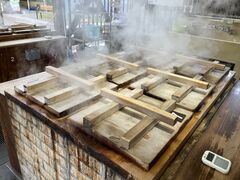 最初受付で番号の札を貰い、券売機で必要な食材を購入し(私は豚肉 しゃぶしゃぶと温泉卵にしました)番号が呼ばれたら受付の隣に食材を取りに行き、蒸釜に持っていきます。ここからは店員さんに教えて貰いながら自分で地獄蒸しを作り、蓋をした後はタイマーを持ってテーブルへ。