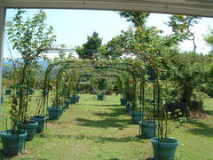 天ヶ瀬農業公園ローズヒル天ヶ瀬内にあるバラ園です。入口のみならず随所にバラのアーチが配置されていました。ビニールハウス内には様々な種類のバラが育てられていました。春か秋が見ごろらしく、お盆前の時期では枯れているか蕾の状態のバラが多かったのですが、それでも多くの種類があると咲いているバラもありました。バラ園自体はそう広くは無いのですが、多くの種類のバラを良く集めたものです。
