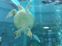 入場するとウミガメにえさをあげられます。レタスを持っていると向こうから近づいてきます。最後は岸部に上がってきて、手から直接レタスを食べるではありませんか?先日、海であったカメとは大違い。水槽の横に回っても接近してきます。うちの猫よりかわいかった。