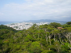 名護市街地の東側の木々に覆われた山にある城郭跡の公園展望台です。展望台が2機あって一方は「天上展望台」と銘打っています。桜が日本で最も早く咲く場所として有名だそうです。名護湾のアーチがきれいに見えます。