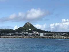 本部港から伊江島にフェリーで近づくと、どんどん城山が間近に迫って来て、迫力あります。港で自転車を借り、だんだんきつくなる坂道を10数分くらい登っていくと、南登山口に着きます。そこからコンクリートの階段を上っていくと、城山売店に着き、さらに上の階段を上ると、城山の山頂に港から40-50分で着きます。オフスクレープ現象という古い岩山が新しい地層にのっかった珍しい山だそうで、急峻で山頂からの眺めは気持ち良いものです。帰りに城山売店のかき氷のぜんざいを食べましたが、疲れた体にとてもしみました。