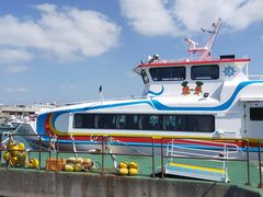 勝連半島先端部の平敷屋港と津堅島(キャロット愛ランド)を、30分で結ぶフェリー。平安座島や青い海に浮かぶ小島を眺めながらのプチ船旅は、揺れも少なく快適でした。高速船を利用すれば15分足らずで到着です。