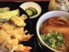 お友達と私はてんぷらとうどんのセットランチ、彼は串カツとうどんのセットランチ。