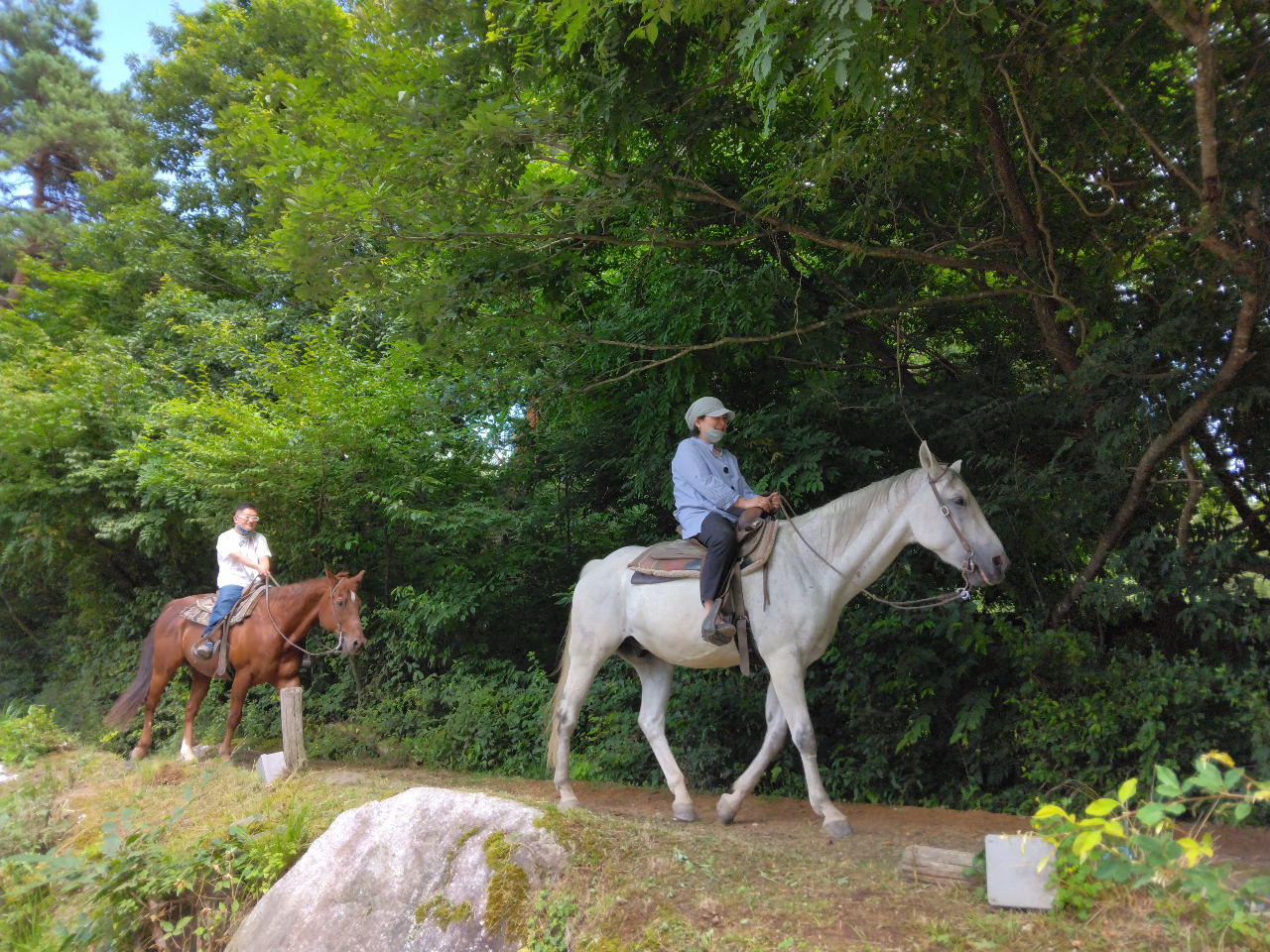 到着するなり人懐っこい猫達にお出迎えされ、その後は馬場に中で簡単な練習をした後山の中でのんびりと馬の背に揺られます。