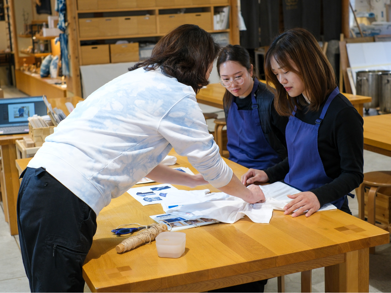 藍甕に浸けて染めていきます。染める時間や回数でお好みの濃さに染めましょう。
