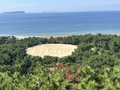 銭形砂絵があるのは、琴弾公園の展望台。ここから見下ろすと、縦122m・横90mという驚くほどの大きさで、砂で描かれた「寛永通宝」の文字がくっきりと浮かび上がっていました。
