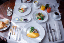 ホテル長楽館の朝食は、3種の生搾りジュースや、自家製ドレッシングを添えたサラダ、京都・大原の有精卵で作る卵料理など、上質な素材を活かしたコース仕立てのご朝食。
