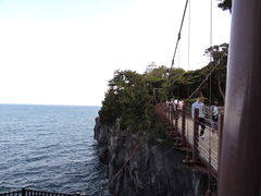 海へ切り立つ断崖が続く、約3km、時間にして1時間30分ほどのハイキングコース。北の起点は食事処のぼら納屋の横から、終点は海洋公園。途中に幕府が黒船の来襲に備えたという砲台跡やヒメユズリハの群落などがある。断崖に架かる門脇吊橋は高さが23mもあってスリル満点。下を見ると吸い込まれそう!