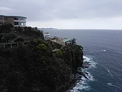 晴れて居たので眺めは最高に良かったのですが、下を見ると断崖絶壁って感じで高所恐怖症の人にはちょっと無理かな?昔は自殺の名所で有名だったらしく、階段を降りてテラスに行くと奥に大きな仏様に菊の花などがあげられて居てちょっと怖かったです(汗)