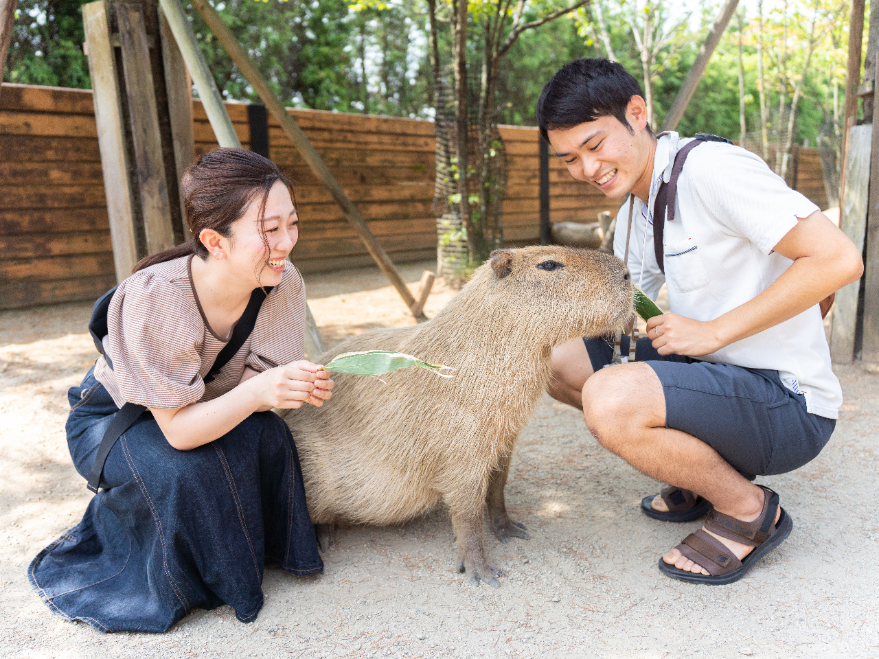 カピバラの森では、100円でカピバラにエサヤリ体験ができます。間近でよーーく観察してみよう!