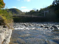 奥入瀬渓流と蔦川合流点に架けられた長さ55mの木造吊橋で、500年も耐久できる日本有数の橋。誰も入れなかった中洲にも入れる様になり、ブナ、ミズナラ、モミジなど原生林の中で森林浴が楽しめる。うぐいす、黄せきれいなどバードウォッチングにも好適。カワセミがイワナを獲るシーンに出会えるかも。
