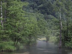 田代池、途中山々からの浅い清な流れが立枯れの木の間を流れる、原生林の中の湿原に清流となっている、スタートの大正池から田代橋まで1,9km