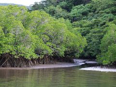 石垣離島港から大原港に入港し船を乗り換え仲間川を上る。広い河口から上流に向かっていくとマングローブが両サイドから近づいてくる。そんな感じの地点まで来ると浅瀬になって船と川岸と水面の高低差を感じなくなりマングローブの森をよりまじかに感じることができる。