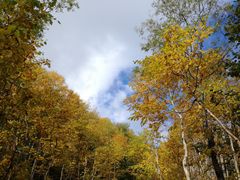銀仙台に行き、ゆっくり黄色い紅葉の道を歩きます。赤岳登山口に着いたら、もう15分ほど歩くと開けた景色になり、赤岳を眺めることができました。残念ながら曇っておりいまひとつな写真ですが、良い空気と紅葉を楽しめました。登山靴かしっかり目の運動靴がオススメです。