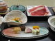次に驚いたのが食事。和会席料理と聞いていたのに「おしながき」がない!? おまけに先付やお造り、炊き合わせ、焼き物、煮物、揚げ物、酢の物、茶碗蒸し、しのぎ(山菜そば)、鍋物、香の物まですべてが一度に卓上に並べられている。会席料理といえば、通常は一品または数品ずつ順番に供されるものなのだが……。これではまるで駅前旅館の食事だ。さらに鍋物(しゃぶしゃぶ)は、席に着いたとたんに火を入れられたため先付やお造り、炊き合わせなどを食べている間にだし汁がどんどん蒸発し、固形燃料も残り少なくなってくるので、慌てて肉と野菜を投入。結局、水炊きになってしまった……。
