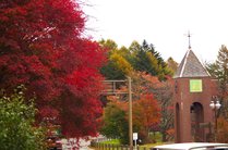 真っ赤に染まった楓とレンガの塔が美しいコントラストを描き、訪れる人々を魅了しています。