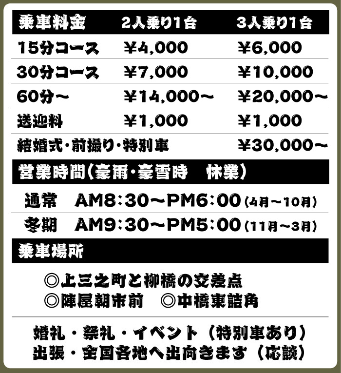 人力車には2人乗りと3人乗りがあり、『一期一会』の心をこめて